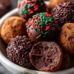 A close-up of several chocolate truffles in a white bowl showing different coatings: one truffle is coated with smooth dark chocolate and decorated with red and green sprinkles on top, another is covered with small dark chocolate sprinkles, and a few are dusted with a light layer of cocoa powder. One truffle is cut in half, showing a dense, rich, fudgy chocolate center with a slightly rough texture inside. The white bowl rests on a white marbled surface, and the image captures the truffles’ varied textures and rich brown colors clearly. photo taken with an iphone --ar 4:5 --v 7