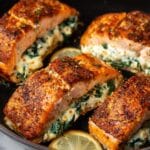 This Baked Stuffed Salmon recipe features tender salmon fillets filled with a creamy mixture of spinach, garlic, cream cheese, and Parmesan, then broiled to perfection with a hint of seasoning and butter. Perfect for a flavorful and elegant weeknight dinner or special occasion, it delivers a delicious balance of rich and fresh ingredients while keeping preparation simple.