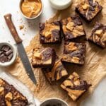 The image shows a set of brownies cut into square pieces and placed on crinkled brown parchment paper over a white marbled surface. The brownies have two main layers: a dark, rich chocolate base and swirls of creamy peanut butter on top, with small pieces of crushed peanut butter cookies scattered across, adding texture and a golden-brown color. Some pieces are stacked slightly, showing the thickness of three to four layers visually blended. Around the brownies are a glass of milk, a knife with a wooden handle, a small white bowl filled with smooth peanut butter, and a white bowl with dark chocolate chunks. Photo taken with an iphone --ar 4:5 --v 7