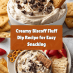 Biscoff Fluff is a creamy, fluffy dessert dip combining smooth cream cheese, marshmallow creme, and flavorful Biscoff cookie butter. Mixed with whipped topping, crushed Biscoff cookie crumbs, and mini chocolate chips, this easy no-bake dip is perfect served chilled alongside cookies, graham crackers, pretzels, or fresh fruit for dipping.