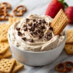 - Serve and garnish: Before serving, let the dip sit at room temperature for a few minutes to soften slightly. Stir gently and transfer to a serving bowl. Garnish with additional mini chocolate chips if desired. Serve with your choice of dippers such as Biscoff cookies, chocolate graham crackers, pretzels, strawberries, or apple slices.