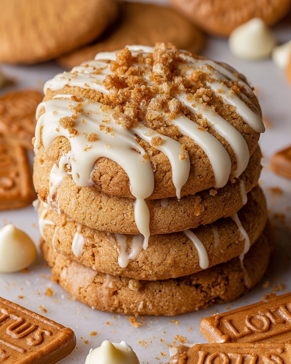 Keywords: Biscoff cookies, snickerdoodle, cinnamon sugar cookies, cookie butter, white chocolate drizzle, soft cookies, homemade cookies, dessert