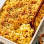 A white square baking dish filled with creamy macaroni and cheese topped with golden crispy breadcrumbs. The macaroni pasta is coated in rich, gooey, yellow cheese sauce with a slightly bubbly texture. A wooden spoon lifts a portion from the dish, revealing soft, cheesy pasta underneath the crunchy topping. The dish sits on a white marbled surface with a small wooden bowl of chopped herbs blurred in the background. Photo taken with an iphone --ar 4:5 --v 7