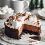 This decadent Cheesecake Chocolat Chaud combines a rich chocolate cheesecake filling with a crunchy Oreo biscuit crust. Baked in a water bath for a smooth, creamy texture, it is topped with lightly sweetened whipped cream and garnished with marshmallows and cocoa powder, making it a perfect indulgent dessert for chocolate lovers.