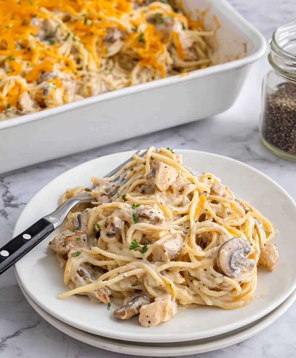 Keywords: Chicken Tetrazzini, creamy chicken pasta, baked pasta casserole, comfort food, cheesy chicken casserole