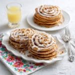 - Serve: Stack the cooked pancakes on plates and generously drizzle or spoon the cream cheese glaze over the top. Optionally, sprinkle additional powdered sugar or chopped nuts for extra texture and flavor. Serve warm and enjoy the perfect cinnamon roll-inspired pancake experience.
