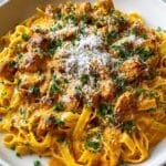Cowboy Butter Chicken Pasta is a hearty and flavorful dish combining tender, seasoned chicken pieces with a rich, creamy butter sauce infused with garlic, smoked paprika, and Parmesan cheese. Tossed with perfectly cooked fettuccine and finished with fresh parsley and a splash of lemon juice, this recipe offers a comforting and satisfying meal in under 40 minutes.