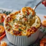 The image shows a white ceramic ramekin filled with a golden-brown baked dish that has a rough, bubbly top layer with browned spots and some green herbs sprinkled over it. A spoon is lifting a portion from the ramekin, revealing a creamy, chunky mixture inside with visible small pieces of orange, white, and green ingredients. Surrounding the ramekin are some cooked shrimp and herbs, all placed on a white marbled surface. A woman's hand holds the spoon, lifting the creamy baked food out. Photo taken with an iphone --ar 4:5 --v 7