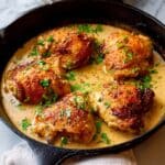 This Creamy French Mustard Chicken recipe features succulent bone-in chicken thighs seared to perfection and then braised in a savory sauce made with shallots, dry white wine, chicken broth, and a blend of whole-grain and smooth Dijon mustard. Finished with a touch of heavy cream and fresh parsley, this dish delivers rich flavors with a creamy texture, perfect for an elegant yet easy dinner.
