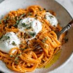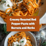 Keywords: Creamy red pepper pasta, burrata pasta, roasted red pepper sauce, vegetarian pasta, Italian creamy pasta, easy pasta recipes