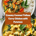 This flavorful Yellow Curry recipe features tender chicken, golden potatoes, and carrots simmered in a rich coconut milk base infused with fragrant yellow curry paste, ginger, and garlic. Perfectly balanced with hints of lime juice, brown sugar, and optional fish sauce, this comforting dish is served over fluffy jasmine rice and garnished with fresh cilantro and a touch of sriracha for a delightful kick.
