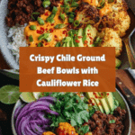 These Crispy Chile Ground Beef and Cauliflower Protein Bowls offer a flavorful, high-protein meal with a perfect balance of smoky, spicy, and fresh flavors. Featuring browned ground beef seasoned with a warm chile blend and served over citrusy cauliflower rice, this recipe is colorful, nutrient-dense, and ready in about 30 minutes. It includes crunchy veggies, creamy avocado, and a tangy yogurt-lime drizzle for a complete and satisfying bowl that is easy to customize.