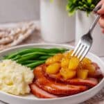 The image shows a white plate on a white marbled surface filled with three main parts: a stack of four slices of glazed ham layered side by side across the plate, topped with small bright yellow pineapple chunks coated in a shiny glaze, a portion of soft, creamy mashed potatoes in a rough, uneven texture on the left, and a serving of fresh green beans that are smooth and glossy arranged in a neat pile at the top. A silver fork held by a woman's hand is picking up a pineapple chunk from the ham. In the soft background, white pots with green plant leaves add a fresh touch. photo taken with an iphone --ar 4:5 --v 7