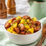 The image shows a white bowl filled with small brown sausages mixed with bright yellow pineapple chunks, topped with small green chive pieces. The bowl is placed on a light green cloth over a white marbled surface. In the background, there are wooden salt and pepper grinders, a green ceramic pitcher, and a wooden utensil handle lying on the right side of the bowl. The food looks glossy and fresh, with the colors contrasting nicely against the white bowl and light background. Photo taken with an iphone --ar 4:5 --v 7
