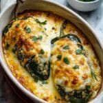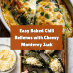 This delicious baked chili rellenos cheese recipe features roasted poblano peppers stuffed with Monterey Jack cheese, coated in a seasoned egg batter, and topped with melted cheddar cheese. Baked until golden and bubbly, it’s a comforting Mexican-inspired dish perfect for a flavorful meal.
