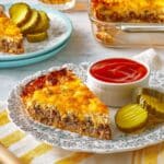 Keywords: Keto cheeseburger pie, low-carb pie, low-carb dinner, keto dinner, cheeseburger casserole, almond flour pie, coconut flour crust, keto recipe
