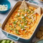 6. Add Final Toppings and Serve: Remove from the oven and drizzle with extra buffalo sauce and ranch dressing. Sprinkle the chopped green onions and feta cheese crumbles on top. Serve the dip warm alongside tortilla chips, veggie sticks, or pretzels for dipping.