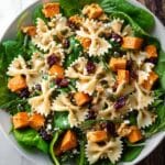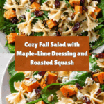 A vibrant fall salad featuring roasted butternut squash, bow tie pasta, baby spinach, toasted pumpkin seeds, dried cranberries, and creamy goat cheese, all tossed in a tangy maple-lime Dijon dressing. Perfect for a seasonal lunch or light dinner, this salad balances sweet, savory, and zesty flavors with a satisfying mix of textures.