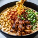 This Fiery Chicken Ramen with Creamy Garlic Sauce is a comforting bowl of spicy, savory goodness perfect for a cozy night in. Tender chicken and fresh ramen noodles swim in a rich, garlicky broth with a creamy kick. It’s easy to make and packed with flavor.