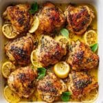 This Greek Lemon Chicken recipe features tender, juicy bone-in chicken thighs marinated in a zesty blend of lemon juice, garlic, oregano, thyme, and Dijon mustard, then baked to perfection with a crispy, golden skin. Perfect for a flavorful and easy weeknight dinner or a casual dinner party.