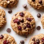 The image shows thick, round oatmeal cookies, each about one layer thick, with a rough texture filled with small oats. The cookies are light brown with darker brown chocolate chips and deep red dried cranberries scattered on top and within. Some chocolate chips and crumbs are spread around the cookies on a white marbled surface. The cookies have a homemade, soft, and chewy look. photo taken with an iphone --ar 4:5 --v 7