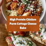 This High Protein Chicken Parm Cottage Cheese Bowl offers a nutritious and delicious twist on the classic chicken parmesan. Layered with creamy cottage cheese blended with Italian seasoning, topped with tender grilled chicken, rich marinara sauce, and a generous blend of mozzarella and Parmesan cheeses, this casserole-style dish is baked to a bubbly, cheesy perfection. It’s perfect for those seeking a high-protein meal that’s satisfying yet balanced.