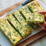 The image shows a white plate with a rectangular vegetable frittata cut into long, thick strips. The frittata has two layers visible: a pale yellow egg base mixed with small green leafy pieces evenly spread throughout. The top is lightly browned with a soft, firm texture, and the sides reveal the green herbs and vegetables mixed inside. A woman's hand is holding one piece of the frittata while a knife lies on the white marbled surface next to the plate. photo taken with an iphone --ar 4:5 --v 7