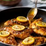 5. Add Sauce Ingredients: Pour in the chicken stock, fresh lemon juice, and honey, then add the lemon slices to the pan with the chicken.