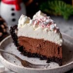 A slice of pie with three layers sits on a white speckled plate on a white marbled surface. The bottom layer is a dark chocolate crust, thick and crumbly, wrapping around the pie's edge. The middle layer is a smooth, thick chocolate mousse, dense and rich with a deep brown color. The top layer is a thick, fluffy white cream with small dollops on the side, mixed with tiny chocolate chips and bits of crushed red and white candy cane. A silver fork lies on the plate near the pie, with mini marshmallows scattered around on the white marbled background, and also a green pine branch and a white snowman mug blurred in the background. photo taken with an iphone --ar 4:5 --v 7