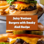 This Juicy Venison Burger with Smoky Aioli recipe combines lean venison meat with savory bacon and aromatic spices for a flavorful burger experience. Topped with sharp cheddar melted to perfection and complemented by a smoky paprika aioli, these burgers are perfect for stovetop or grill cooking. Served on toasted buns with your favorite fresh toppings, it’s a gourmet twist on a classic burger that’s sure to impress.
