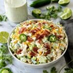 A white bowl filled with a mixed salad showing about three layers: the base layer is made of shredded white chicken, the middle layer has small green cucumber pieces and shredded pale orange cheese, and the top layer is scattered with irregular small pieces of crispy reddish bacon. The salad looks creamy with a white dressing mixed throughout. Around the bowl, there are fresh green jalapeños, sprigs of green cilantro, and halved limes on a white marbled surface. A jar with white sauce and its black lid with some sauce visible inside sit behind the bowl. photo taken with an iphone --ar 4:5 --v 7
