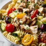 Keywords: Mediterranean chicken pasta salad, healthy pasta salad, grilled chicken salad, feta cheese salad, fresh pasta salad, lemon olive oil dressing