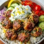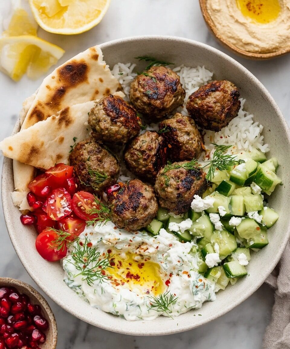 Mediterranean Gyro Bowls combine flavorful lamb meatballs, refreshing tzatziki sauce, zesty lemon rice, and a crisp cucumber salad for a wholesome, satisfying meal that brings the vibrant tastes of the Mediterranean to your table.