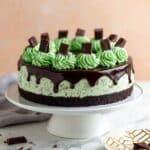 - Step 6: Whisk the remaining 3/4 cup heavy cream with confectioners’ sugar, mint extract, and green food coloring until stiff peaks form. Pipe or spread the whipped cream over the ganache. Decorate with Andes mints or Oreo cookies as desired before serving.