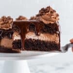 Keywords: no bake cheesecake, fudge brownie cheesecake, chocolate cheesecake, easy dessert, chocolate dessert, layered cheesecake, fudge sauce, brownie base