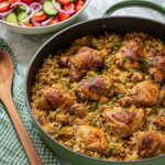 This One Pot Shawarma Chicken and Rice recipe offers a flavorful, aromatic and easy-to-make meal combining tender, spiced chicken thighs with fragrant long grain rice. The dish is cooked entirely in one pan, starting with searing spicy marinated chicken and finishing by steaming the rice in chicken stock, making it an efficient and delicious option for weeknight dinners or casual gatherings.