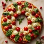 This festive Pizza Wreath is a perfect and easy Christmas party appetizer, featuring a delicious combination of pizza sauce, mozzarella balls, cherry tomatoes, pesto, and fresh basil baked on a crispy pizza crust shaped like a holiday wreath.
