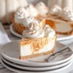 A slice of creamy pie with three visible layers sits on a stack of white plates with a silver fork beside it; the bottom layer is a firm, light brown crust, the middle layer is thick and white, and the top layer is swirled with orange and white in a marbled pattern. On top of the slice is a swirled dollop of white whipped cream dusted lightly with brown cinnamon. In the background, the whole pie shows multiple similar whipped cream dollops on top and there are white pumpkins blurred in the back. The setting is on a white marbled surface. photo taken with an iphone --ar 4:5 --v 7