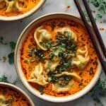Quick Coconut Curry Soup with Dumplings is a flavorful and comforting vegan soup that combines creamy coconut milk, aromatic Thai curry paste, and savory vegetable broth, enhanced with tender cremini mushrooms and vegan dumplings. This easy-to-make stove-top dish is perfect for a cozy meal with a hint of exotic flair, garnished with fresh herbs and a touch of chili oil for a spicy finish.