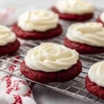 Keywords: red velvet cookies, cream cheese frosting, holiday cookies, chocolate cookies, baked cookies, festive desserts