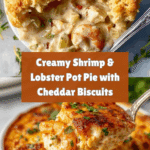 This Shrimp & Lobster Cheddar Bay Biscuit Pot Pie combines succulent seafood in a creamy, flavorful sauce topped with golden, cheesy cheddar bay biscuits. It’s a comforting and luxurious twist on classic pot pie, perfect for seafood lovers seeking a hearty and delicious meal.
