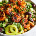 A flavorful and vibrant Spicy Shrimp Chickpea Salad that combines marinated sautéed shrimp with toasted chickpeas and a fresh medley of cucumbers, tomatoes, peppers, and herbs. This salad is dressed with olive oil and lemon juice for a zesty, light meal perfect for lunch or a healthy dinner.