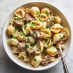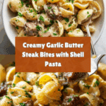 This dish combines juicy steak bites with tender shell pasta, all coated in a rich garlic butter Alfredo sauce. It’s a comforting meal that’s quick to prepare, perfect for a satisfying weeknight dinner or a special occasion at home.
