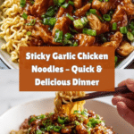 This Sticky Garlic Chicken Noodles recipe features tender chicken pieces coated in a flavorful, sticky garlic sauce paired with perfectly cooked noodles. With hints of honey, soy, ginger, and a touch of chili flakes, this dish is a delicious blend of savory and sweet that comes together quickly using simple ingredients and stovetop cooking.