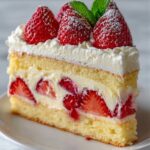 - Top Cake: Spread the remaining custard evenly over the top layer. Arrange halved fresh strawberries decoratively on top.
