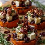 Sweet Potato Rounds with Brie, Cranberry & Pecans make a delightful appetizer or snack that’s both sweet and savory. The combination of creamy brie, tart cranberries, and crunchy pecans atop tender roasted sweet potatoes is sure to impress at any gathering.