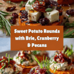 Sweet Potato Rounds with Brie, Cranberry & Pecans is a deliciously warm and festive appetizer featuring tender roasted sweet potato slices topped with creamy melted brie, fresh tart cranberries, and crunchy pecans. This easy-to-make recipe combines sweet, savory, and nutty flavors perfect for holiday gatherings or cozy snacks.