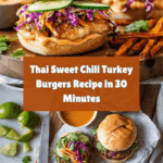 Keywords: Thai turkey burgers, sweet chili sauce burgers, grilled turkey burgers, healthy turkey burger recipe, Asian turkey burgers, easy weeknight burgers