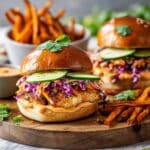 These Thai Sweet Chili Turkey Burgers are a flavorful twist on the classic burger, featuring ground turkey infused with sweet chili sauce, fresh herbs, and aromatic spices. Perfectly grilled to juicy perfection and served with crisp lettuce, cucumber, and red onion on whole wheat buns, they offer a delicious and healthy meal option with just the right balance of spicy and sweet flavors.