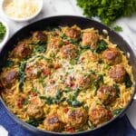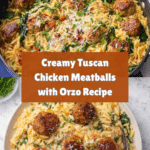 This Tuscan Chicken Meatballs and Orzo recipe features tender chicken meatballs simmered in a flavorful creamy Tuscan sauce with sun-dried tomatoes, Parmesan, and fresh spinach, served over perfectly cooked orzo pasta for a comforting and hearty Italian-inspired meal.